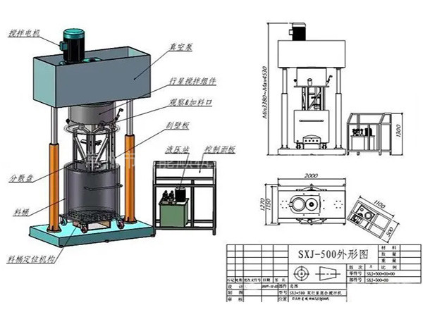 雙行星混合攪拌機是一種對多種液體、粉體進行混合攪拌、溶解、分散、均質的攪拌設備,分為減速電機、封蓋、行星架,高速、低速、活動刮板三軸,刮壁器、料桶、雙柱液壓升降系統、真空系統以及機架等構成。雙行星混合攪拌機能在真空下工作,可不斷的排出水分和其他的揮發物,因此,可作為脫氣釜使用。料桶可根據需要采用油、水循環加熱或冷卻;也可使用蒸汽加熱。加熱溫度通過控制面板上的溫度控制儀顯示。行星分散混合機(行星攪拌機)廣泛應用于高粘度電池、涂料、有機硅膠、油墨、染料、粘膠劑等。